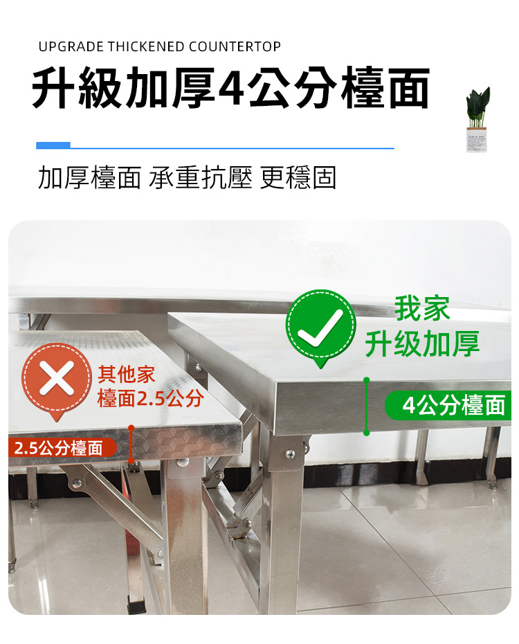- 📌 高耐用性: 無論是不鏽鋼工作桌還是加厚摺疊桌,都使用優質不鏽鋼材料製成,具備抗腐蝕和高強度的特性,長期使用不易損壞。