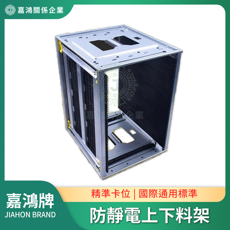 SMT 前後段作業之間的 PCB 板件暫存若使用普通料架,容易因靜電累積傷及板上已焊元件,也可能因卡槽鬆動造成板件滑落刮傷。防靜電上下料架從材質和槽規設計雙重解決這兩個問題。