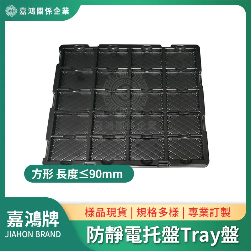 此尺寸段的防靜電 Tray 盤比透明版提供更嚴格的靜電管控,適合線體上同時運行多款帶 IC 的模組料件、需要符合客戶 ESD 稽核要求的 EMS 廠,以及汽車電子、通訊設備等對靜電敏感度要求較高的產業。若元件無 ESD 管控需求,可改選透明方形吸塑盤 ≤90mm,格型選擇更廣。