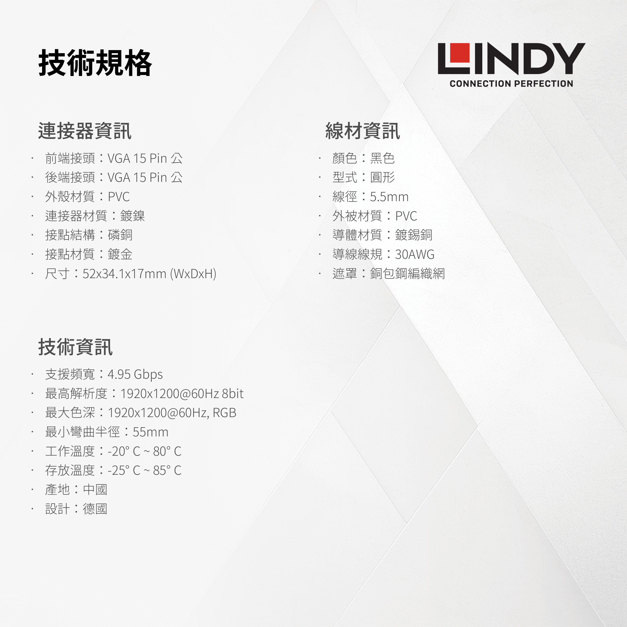 LINDY VGA傳輸線|工控/教學/投影設備 1920×1200@60Hz 穩定訊號選型
