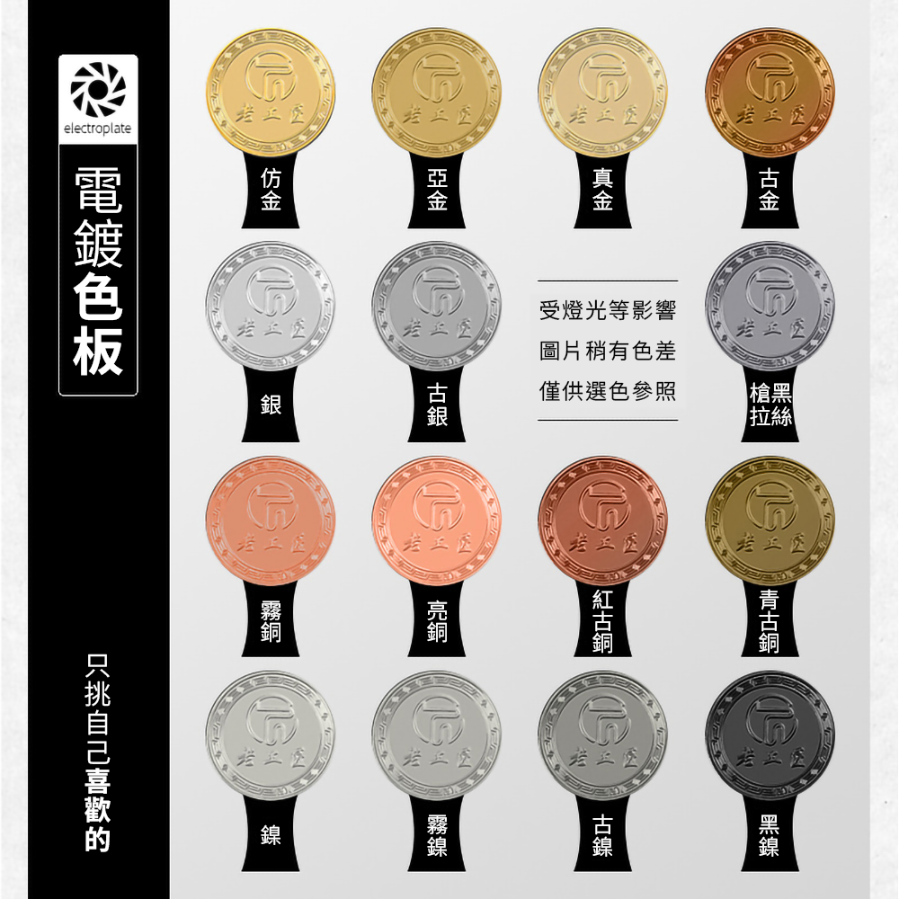 - 電鍍色板多樣可選:仿金、亞金、真金、古金、古銀、銀、青古銅、紅古銅、亮銅、霧銅、鎳、黑鎳、古鎳、霧鎳。