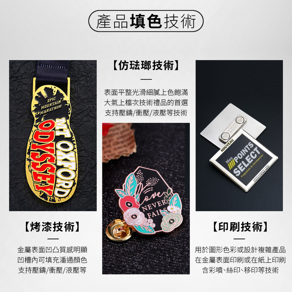- 填色工藝包含仿琺瑯、烤漆、印刷(彩噴/絲印/移印),色彩飽滿層次分明。