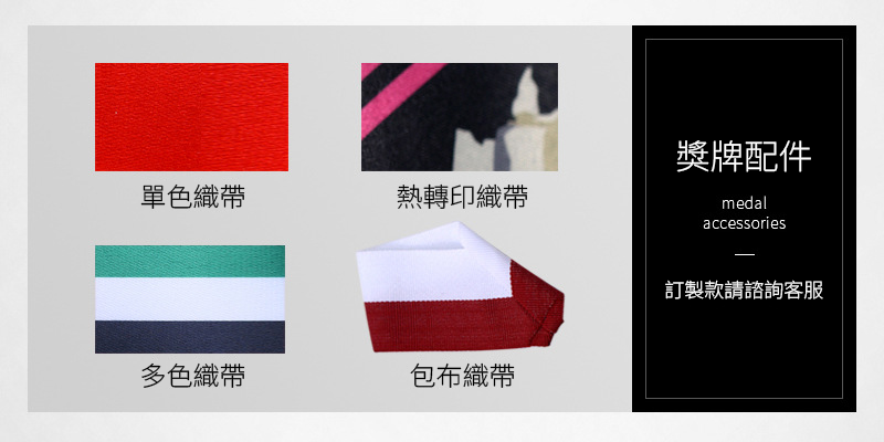 - 獎牌配件多樣:單色織帶、熱轉印織帶、多色織帶、包布織帶,滿足客製企業獎牌整體搭配需求。