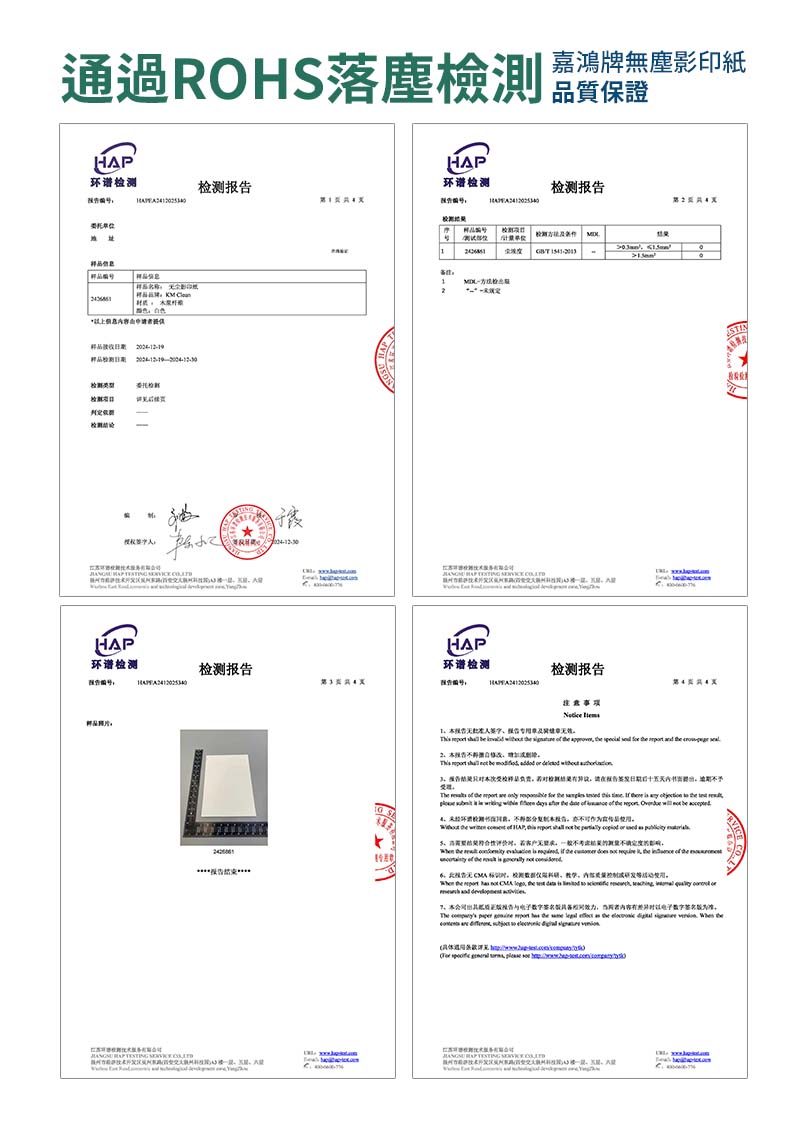 RoHS 落塵量檢測報告:嘉鴻牌無塵影印紙已完成 RoHS 多項檢測及落塵量驗證,可提供客戶採購審核或無塵室管理規範存檔。