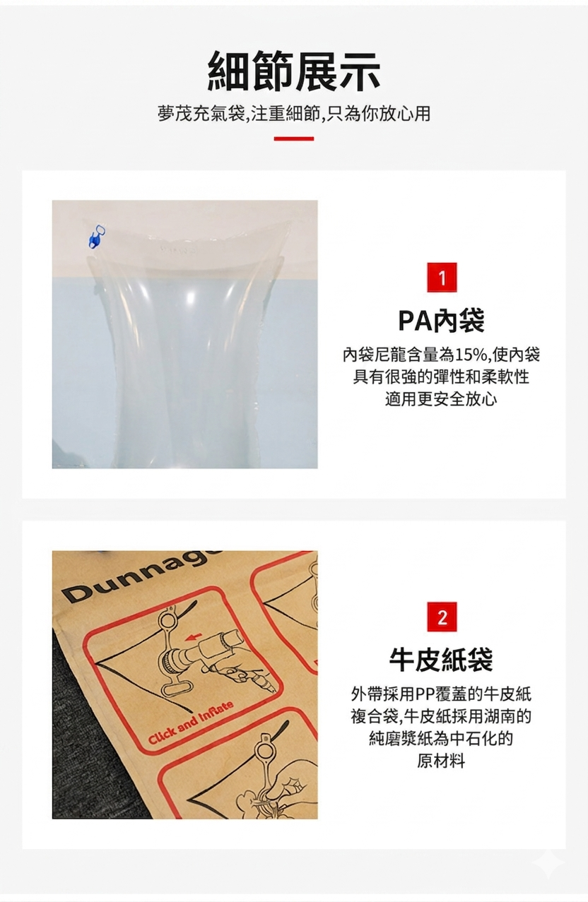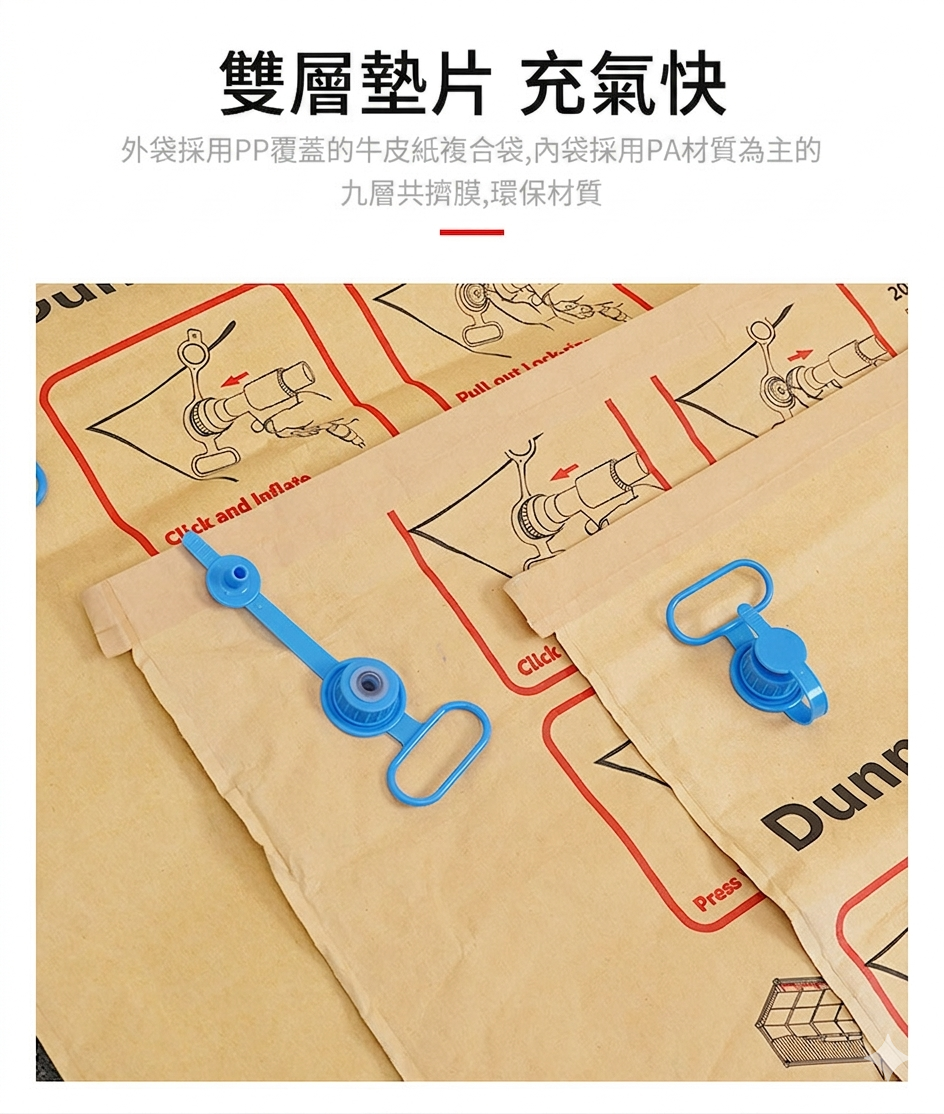 本款採多層牛皮紙外袋複合 PE 氣密內袋結構。牛皮紙外層具備良好的拉伸強度與高摩擦係數,充氣後緊貼貨物表面不易滑移;PE 內袋氣密性高,充氣後可維持工作壓力(0.2 bar)穩定不洩氣。工作充氣壓力僅 0.2 bar,但充氣後整個袋面對貨物產生的總側向力可達數公噸,足以穩固標準棧板貨物。爆破安全壓力為 0.6 bar,三倍安全餘量確保操作安全。