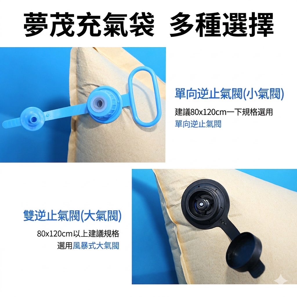 氣閥選用原則:80×120 cm 以下規格選用單向逆止氣閥(小氣閥),充氣操作輕巧快速;80×120 cm 以上建議選用雙逆止大氣閥(風暴式大氣閥),充洩氣效率更高,適合大尺寸袋體的快速定位。