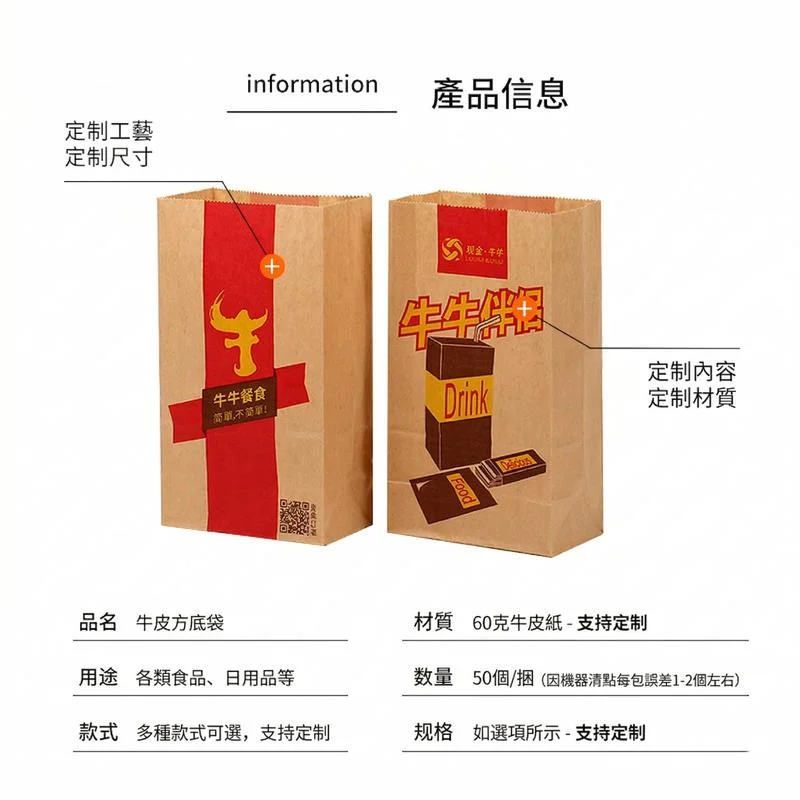 60 克牛皮紙方底袋,牛皮色與白色兩款可選,多種尺寸公規現貨供應。支援訂製印刷 LOGO、指定尺寸與材質客製,50 個/捆起訂,是工廠出貨、門市包裝、食品盛裝的實用選項。