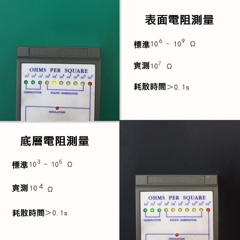 - 定期以 ESD 量測器確認阻值:橡膠墊長期使用後表面可能因污染導致阻值偏移,建議定期確認是否仍在規格範圍內。