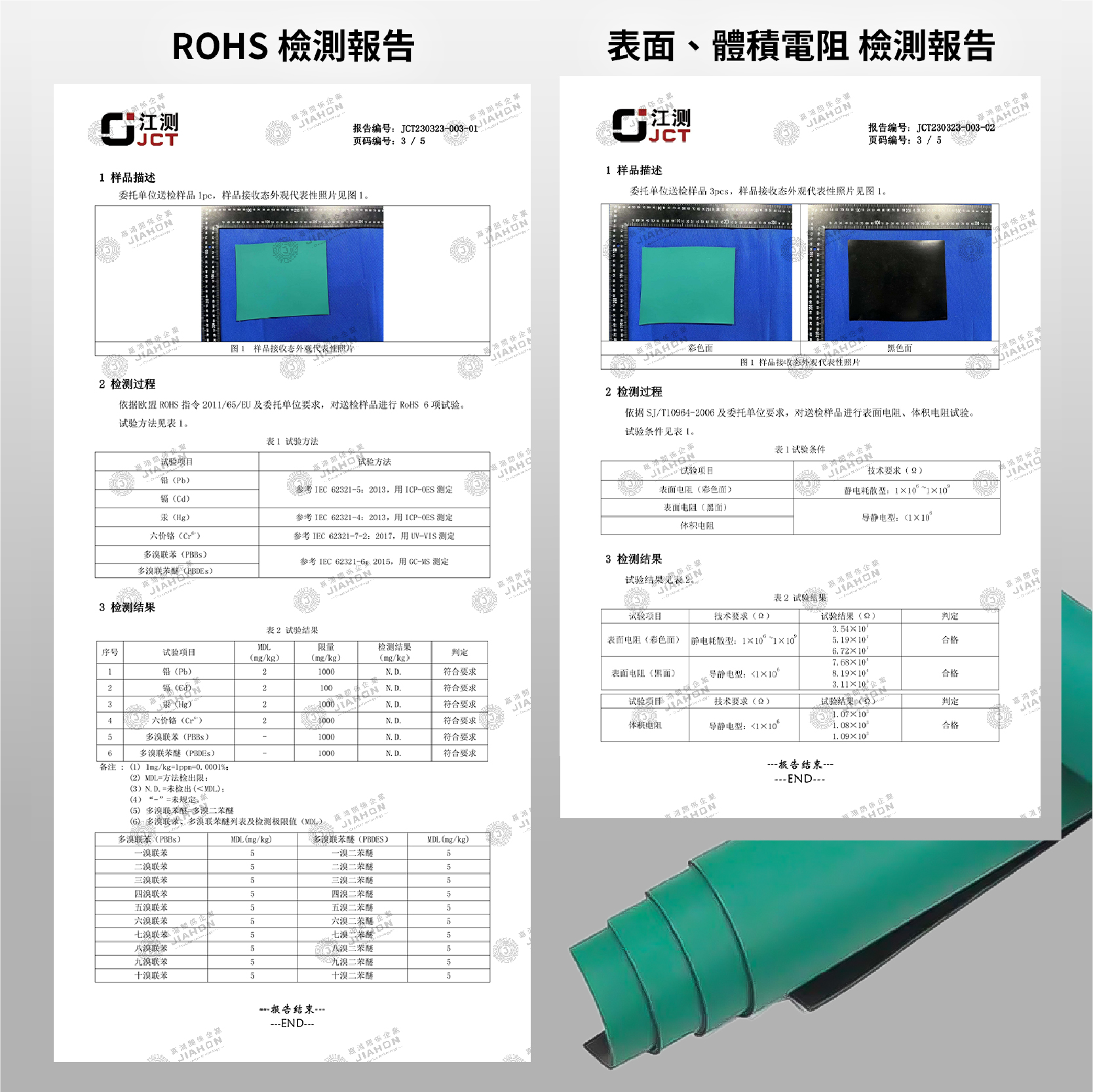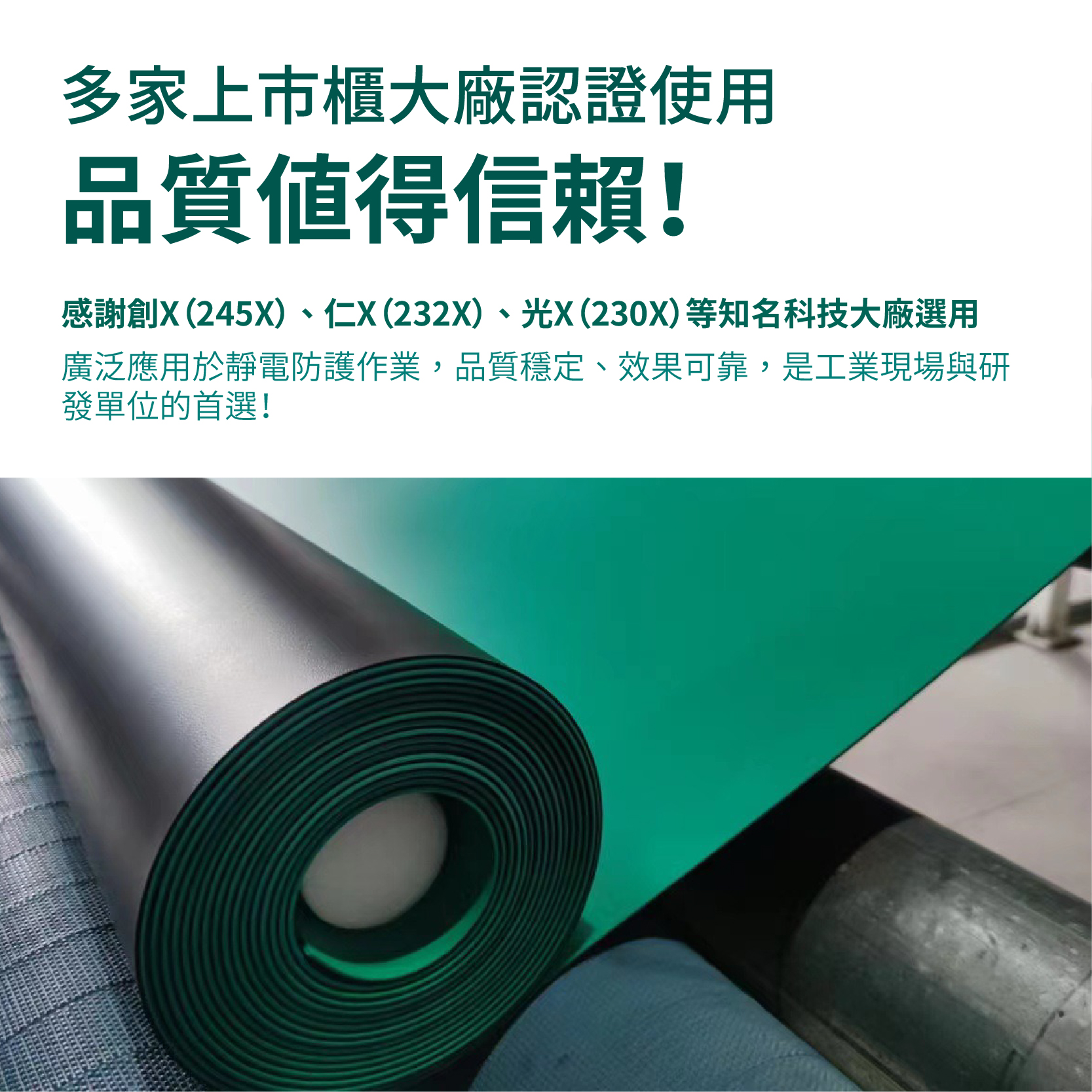 | 無鹵防靜電桌墊 | 綠色(無鹵) | 不含鹵素,符合特殊製程環保要求 | 軍規、航太、特殊認證廠 | 整捲(寬度 × 10m) |