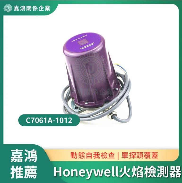 Honeywell C7061A 系列俗稱「Purple Peeper」,因其紫色鑄鋁外殼而得名。C7061A-1012 是標準型號,具備動態自檢功能——內建振盪快門會週期性遮蔽 UV 感測管,若快門或感測管失效,控制器將判定為故障並觸發安全停機。