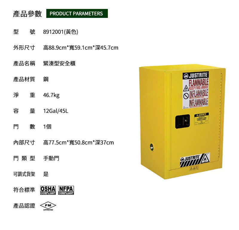 | 8912001 | 12 加侖 | 45 升 | 🟨 黃色(易燃液體) |