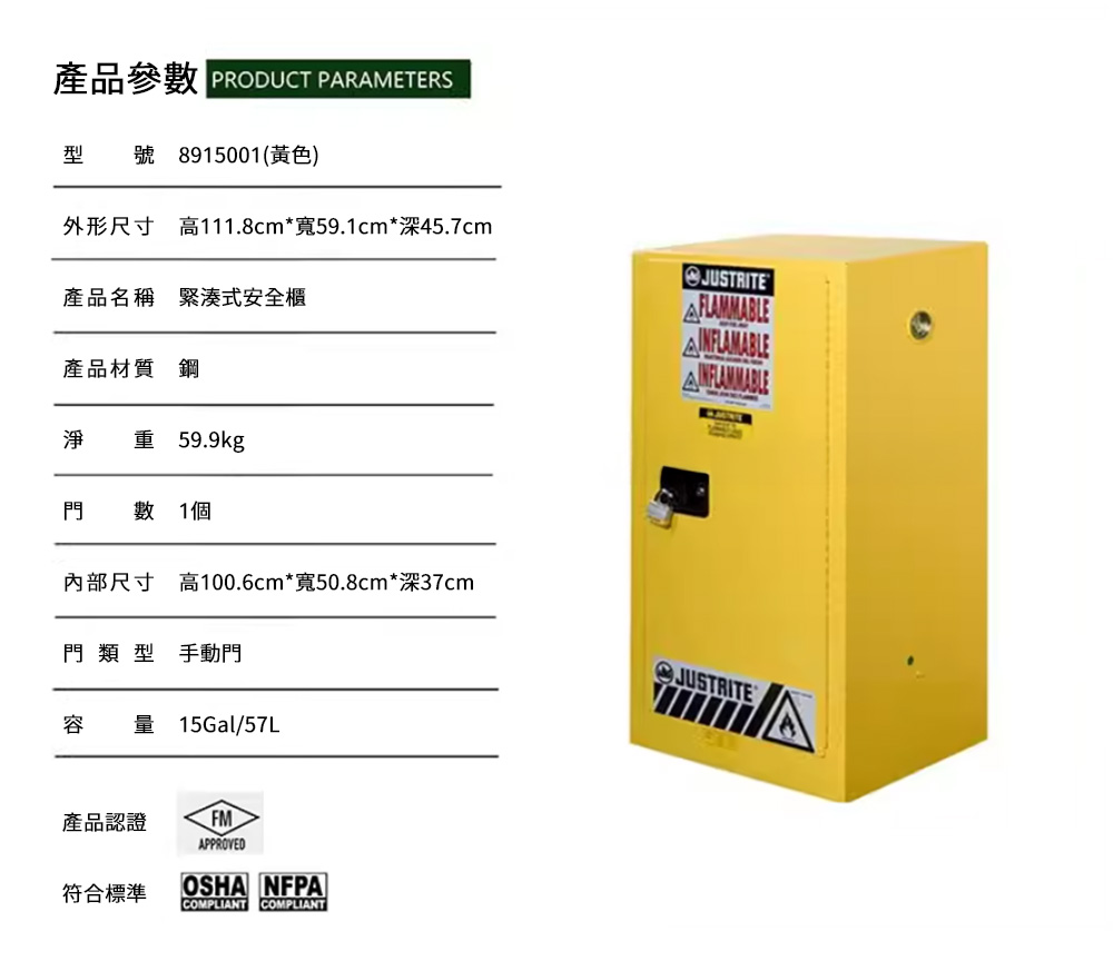 | 8915001 | 15 加侖 | 57 升 | 🟨 黃色(易燃液體) |