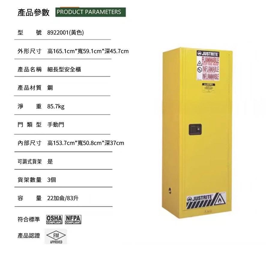 FM 認證是工業防爆安全櫃的最高公信力標準之一。Justrite Sure-Grip EX 系列依據 OSHA 29 CFR 1910.106 與 NFPA 30 設計製造,並通過 Factory Mutual(FM)認證,提供有規可循的易燃化學品儲存解決方案,附 10 年製造保固,適用於化工廠、製藥廠與實驗室等高規格安全要求場所。