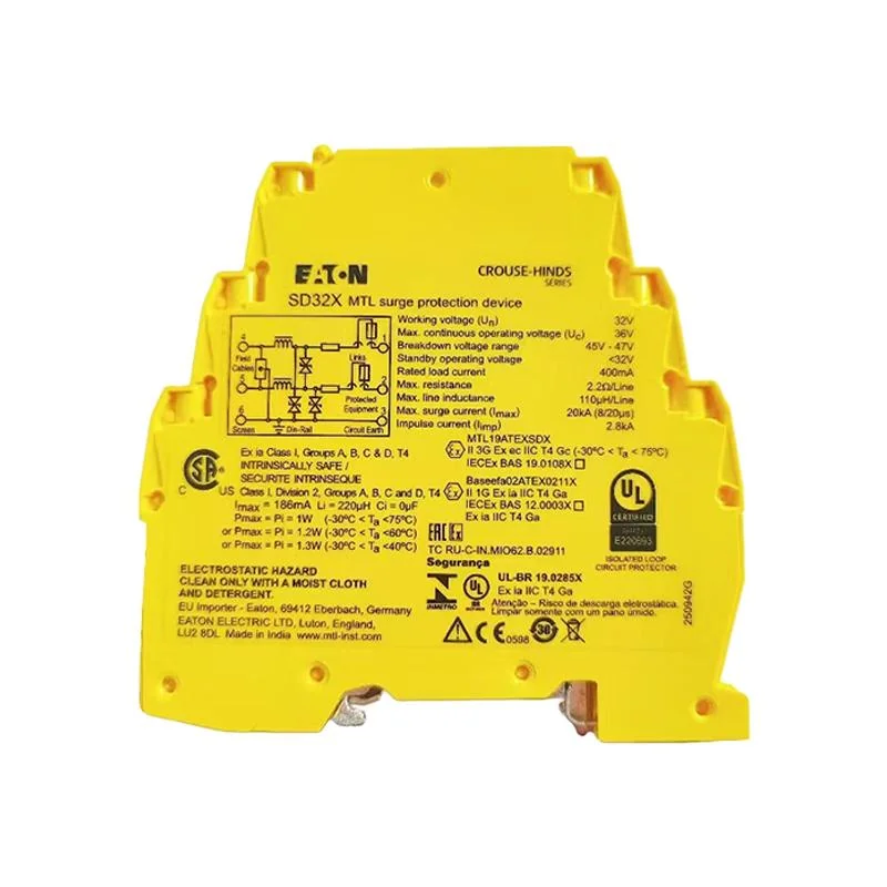 MLT SD32X 突波吸收器(Surge Absorber)用於吸收工業控制線路中的突波(Surge)、暫態過電壓(Transient Overvoltage)與電磁干擾(EMI),保護 PLC 輸入/輸出模組、感測器、傳送器等精密電子設備免受損壞。DIN 導軌安裝,安裝於電源線或訊號線與受保護設備之間。