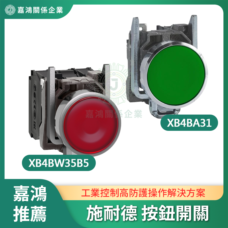 Schneider Electric Harmony XB4 系列為金屬邊框 22mm 工業按鈕開關,模組化設計可依需求組合操作頭(Button Head)與觸點模組。本頁涵蓋 5 款:照光式發光按鈕(XB4BW35B5、ZB4-BW343)提供狀態可視;標準按鈕(XB4BA31)適合設備啟動等一般控制;全系 22mm 切孔,IP66/67/69K 高防護,金屬邊框耐腐蝕。