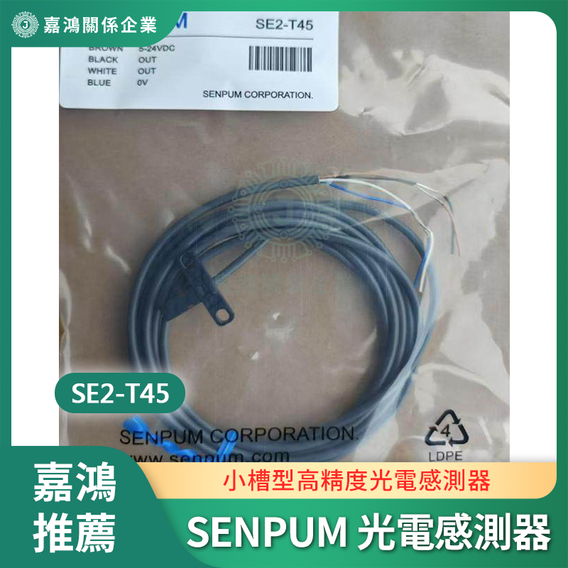 SENPUM SE2-T45 為小槽型光電感測器,5 mm 固定槽寬一體成型,重複精度優於 0.01 mm,入光反應時間 20 μs、遮光反應 80 μs,配備 940 nm 紅外 LED 與橘色狀態指示 LED。5–24V DC 寬電壓輸入,NPN 輸出同時具備 NO 與 NC 兩路,適用精密轉盤原點定位、IC 引腳計數以及各類需要高重複精度的自動化感測場合。