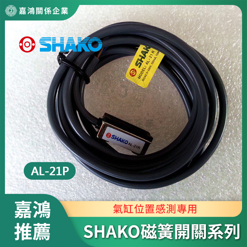 AL-21P 是 SHAKO 氣缸的原廠指定配套感測開關,相容性已由廠商認證,毋需另行計算尺寸。確認氣缸系列後直接選型;線長依安裝位置至控制盤距離選擇 1M / 2M / 3M。
