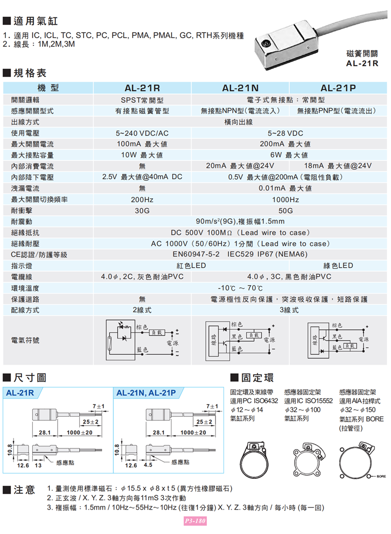 選型提示:確認氣缸系列後選 AL-21P,再依「感測器到控制盤/控制器的實際走線距離」選定線長,寧可選長勿選短(多餘的線材可繞圈固定)。如使用延長線接續,需確認接續點的防護等級。