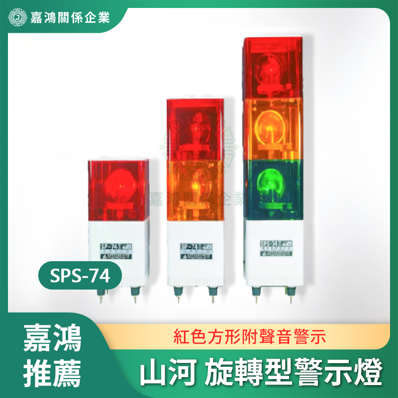 機台異常時,只有燈光在旋轉、沒有聲音,操作員在嘈雜環境下很可能看不到。山河 SPS-74 旋轉型警示燈採聲光雙重警示設計——旋轉燈光搭配內建蜂鳴器,方形燈體 82mm 四角透光,光域涵蓋廣,AC220V / DC12V 雙電壓,10W 高亮度紅色,皮帶傳動降低運轉噪音,適用各式工業機台與自動化設備的警示需求。